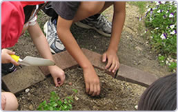 栄養士と保育士が協力し、植栽活動や紙芝居、クイズなどを通して、「食」の大切さ・知識・マナーを身に付けていけるように援助しています。