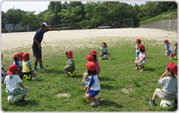 3歳児、4歳児、5歳児は毎週2回、体育(サッカー)の授業があり、楽しむ体育(サッカー)を指導しています。